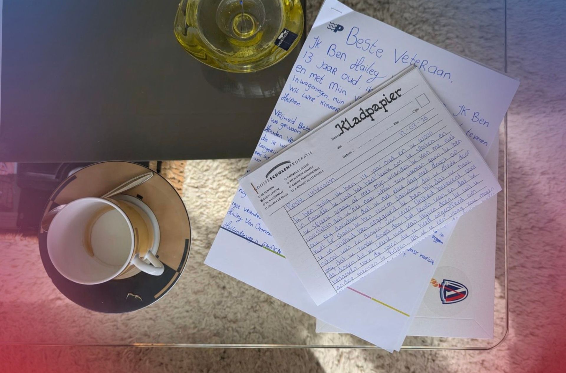 De dag begon in het Visum Mundi in Wageningen, waar onder andere burgemeester Vermeulen stilstond bij de zesde editie van de brievenactie: “Gaan jullie na 80 jaar vrijheid nog door? Ja, natuurlijk!” Ook veteraan meneer Wilbrink was aanwezig. In gesprek met oud-deelnemers van de Brievenactie, Lotte en Ilse, vertelde hij hoe bijzonder de brieven voor hem zijn: “Het is echt een opkikker om ze elk jaar te ontvangen.” Voor de leerlingen zelf maakt het schrijven een diepe indruk: vrijheid komt zo ineens heel dichtbij.